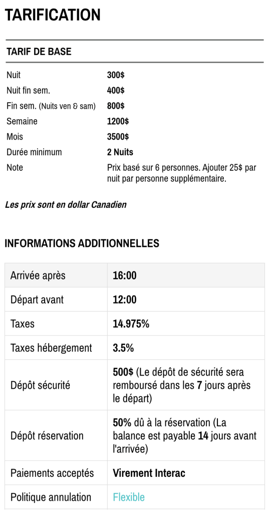Tarifs et informations additionnelles